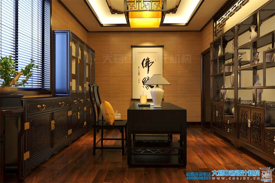 中式書(shū)房家具顏色很重,空間儒雅氛圍也更加濃郁