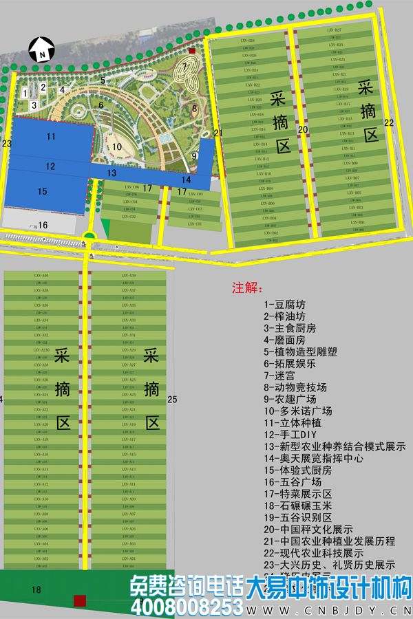 從大平面圖上,我們可以清楚的看到整個(gè)農業(yè)科技體驗園的功能區域規劃。