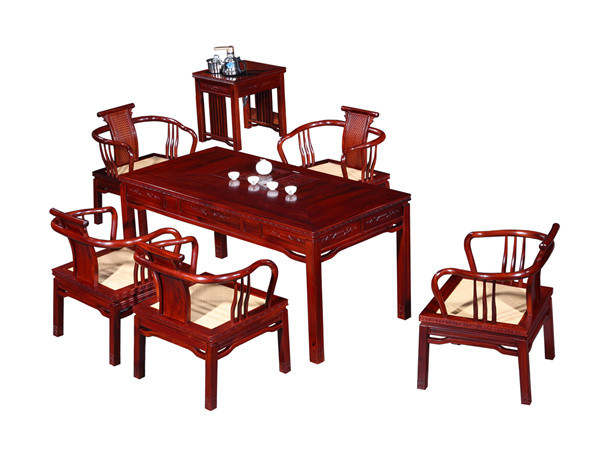 其中:一張茶桌、五把紅木椅子和一件紅木茶水柜,