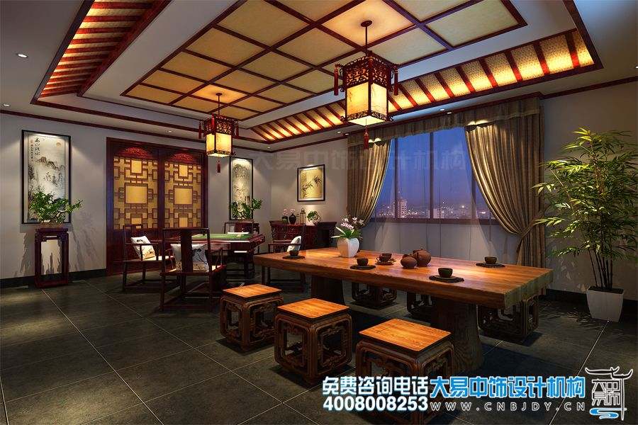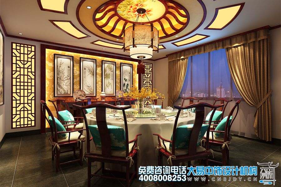 此案例本是餐飲會(huì )所中式設計裝修,所以就餐區的裝飾就更為重要。圖中雅間背景墻懸掛“梅蘭竹菊”四君子畫(huà)幅,彰顯名士清流的高貴品格,淡泊名利的人格品性。又以金色祥云圖案為底色,傳達中國傳統符號的特色韻味,吉祥美滿(mǎn)、和諧共生。圓形吊頂更是以牡丹圖為飾,圓形宮燈流蘇低垂,與圓形餐桌相互輝映,團團圓圓,和和美美,整體烘托的古風(fēng)雅韻、色感優(yōu)美,展示出中式裝飾的富麗與華美。