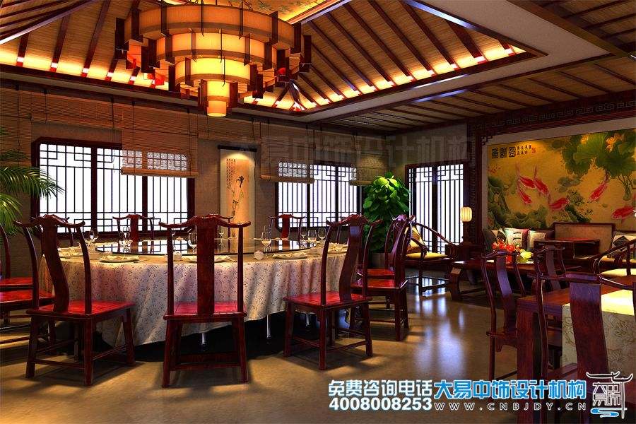 餐飲大包間用藻井式吊頂,塔狀宮燈,大氣華麗。窗欞簡(jiǎn)約而設,以竹簾為飾,仿佛有純木氣息縈繞四周。正堂設一羅漢床,可以隨意坐臥,與整體餐飲桌椅協(xié)調一致。背景墻是巨幅錦鯉圖案,吉祥如意,富貴大雅。