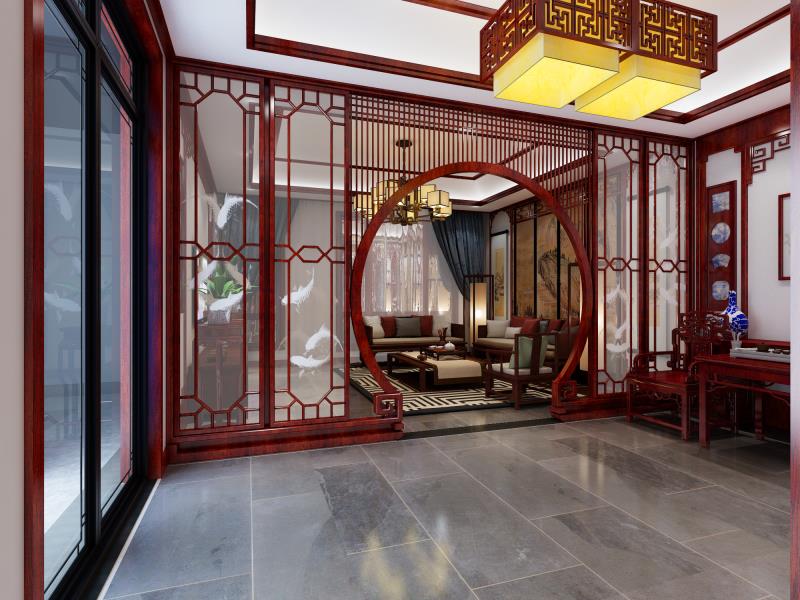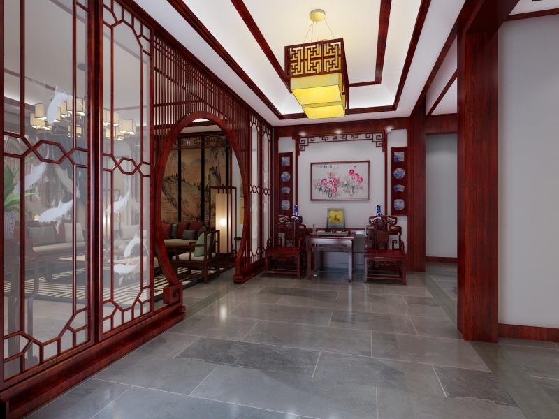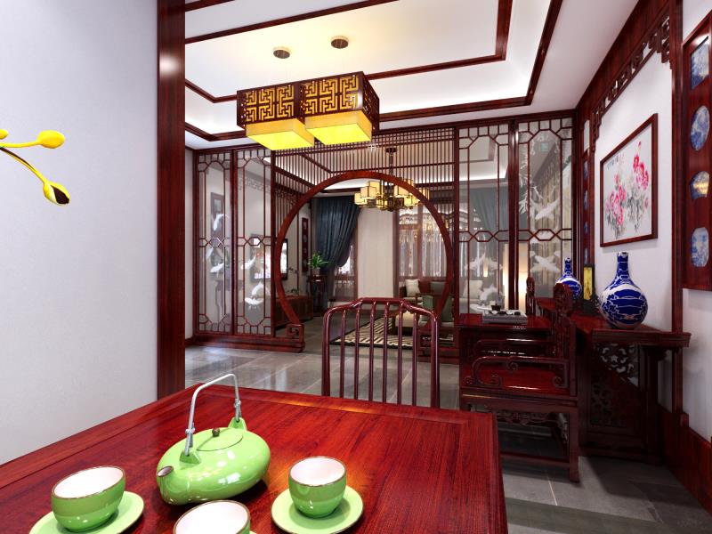 大易中飾負責設計一款四合院裝修客餐廳的中式設計,主要是以實(shí)木家具為主,紅色調設計。