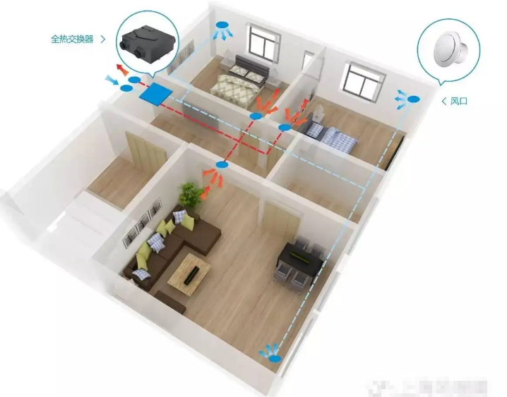 正確的打開(kāi)方式:室內外的進(jìn)風(fēng)口和出風(fēng)口都要盡量的遠,最好的距離一般在1米以上,最短間距也要有三倍管徑長(cháng)度,來(lái)避免剛剛進(jìn)入室內的新鮮空氣就被馬上排出。