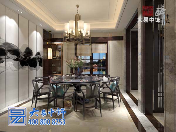餐廳中式設計裝修,選用白灰色、琥珀色輕奢風(fēng)格色調,整個(gè)空間呈現出一種優(yōu)雅而不張揚的味道。圓形餐桌,改良中式座凳,八角宮燈別具一格。
