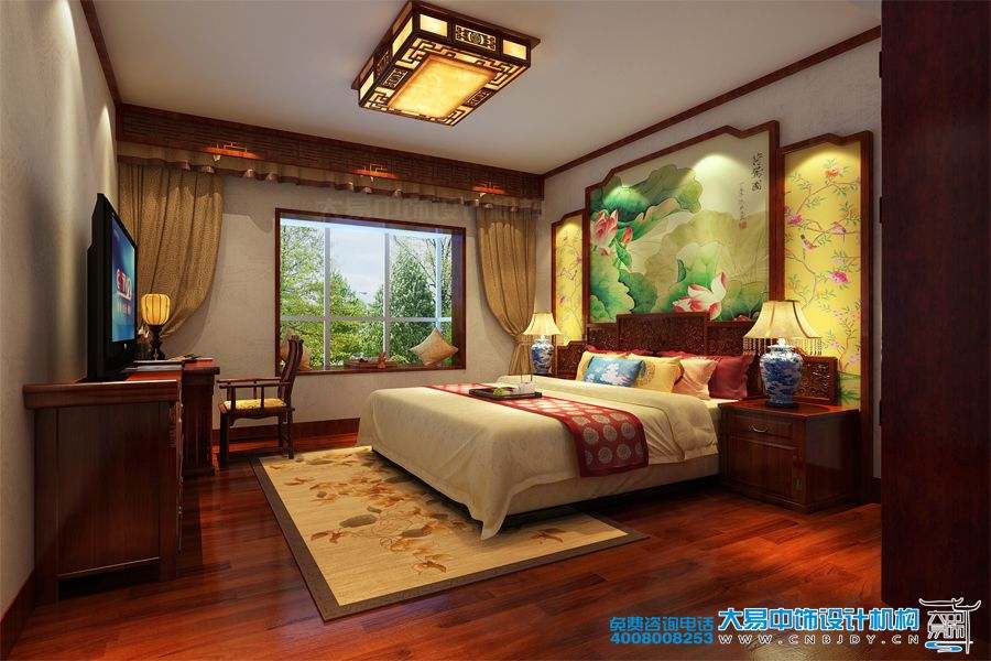 住宅中式設計裝修案例中,該臥室的設計讓明亮自然,窗外是一片綠植,每天早上都可以將大自然的色調盡收眼底。床具背景是巨幅蓮花圖案,與整體環(huán)境的清幽自然相融恰,在臥室休息的同時(shí),也可以有很好的視覺(jué)感受空間??看皵[放一書(shū)桌,臥室在休息的同時(shí)可以兼作書(shū)房使用。飄窗做了簡(jiǎn)單處理,摒棄繁雜,以最清爽的態(tài)度迎接每天的生活。
