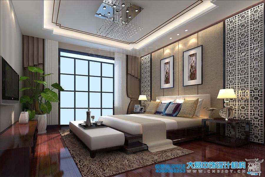 主臥室空間采取局部淺色中式窗花,體現出中式家居的空間化、舒適感