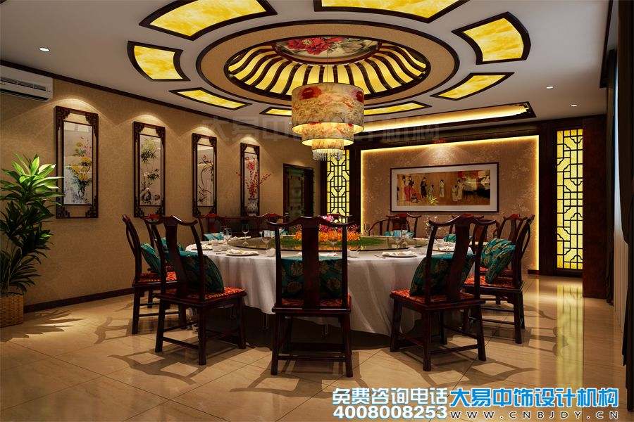 餐廳中式裝修,吊頂燈以古色古韻的圓形花格作為裝飾,彰顯傳統文化的元素,典雅別致??臻g以溫潤色做為基礎,加上室內壁畫(huà)的渲染,有種重巒疊翠、循環(huán)往復的意味在其中。