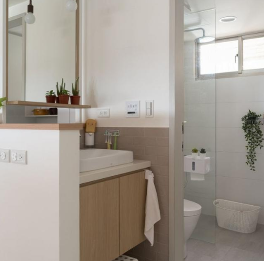 洗手臺外移后,可能會(huì )覺(jué)得光禿禿有點(diǎn)不美觀(guān),所以空間足夠的話(huà),可以做上隔斷進(jìn)行遮擋,像是黑框玻璃、鏤空隔斷都是個(gè)不錯的選擇~
