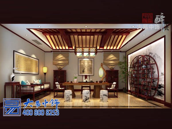 茶室中式設計,東廂房在中堂右側,有一簾之隔。此處窗洞多在高處,有竹簾低垂而飾。實(shí)木茶桌置于空間之中,座凳有木椅也有瓷墩,古樸雅致。博古架與水墨畫(huà)點(diǎn)綴著(zhù)空白的墻面,充滿(mǎn)禪意的吊燈在根雕的裝飾下散發(fā)出幽然明亮,靜謐而深沉。