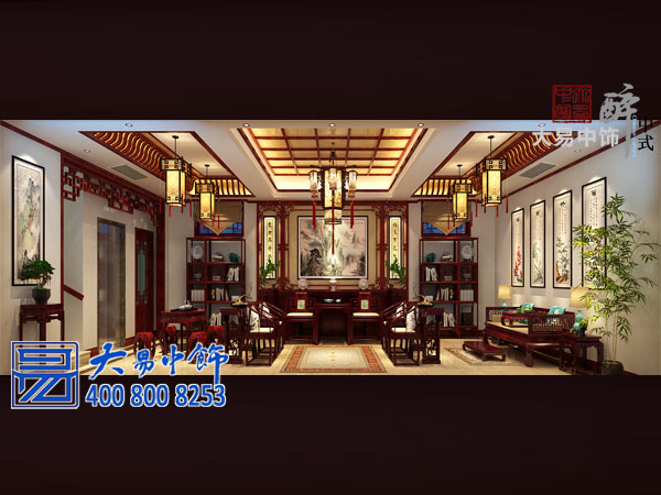 中式四合院設計,推門(mén)而入,中堂全景映入眼簾。正堂太師座椅分列兩旁,條案靠墻而設,上置白瓷擺件,有山水國畫(huà)為背景墻飾,燈箱映襯的聯(lián)幅加以點(diǎn)綴,墻面多以書(shū)畫(huà)作品為飾,彰顯業(yè)主門(mén)第書(shū)香特色。